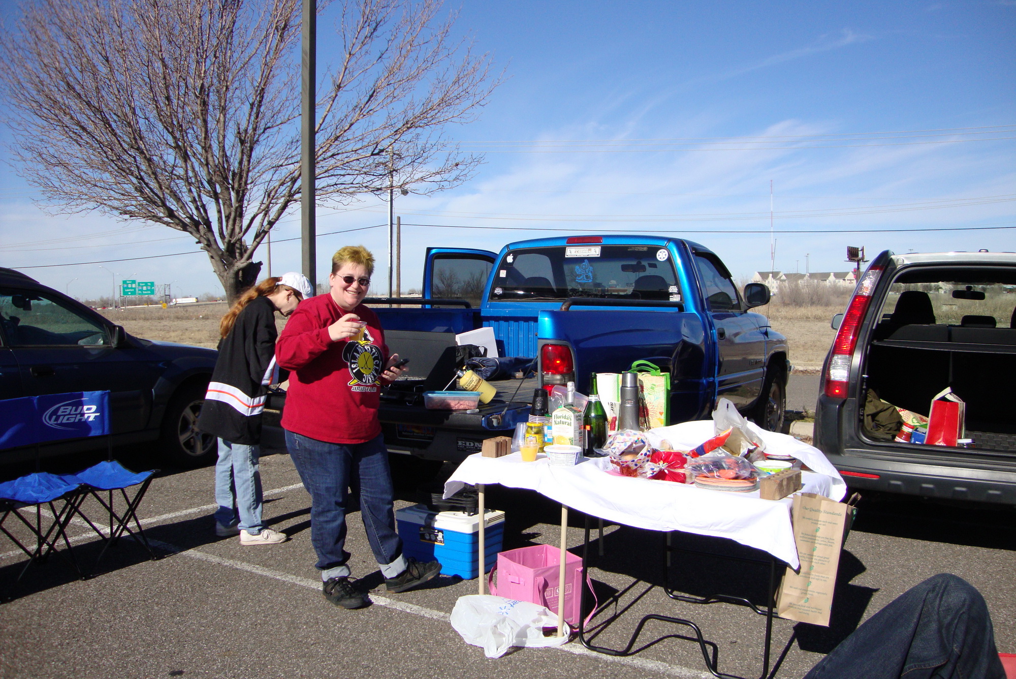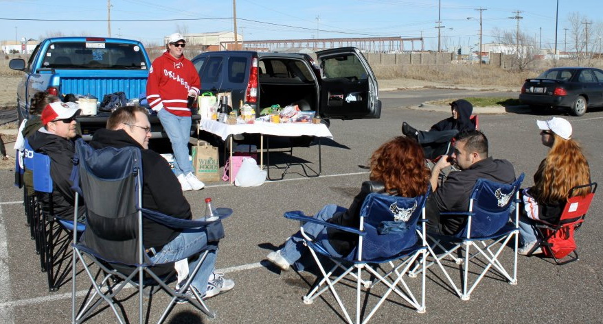 Here in the southern states where football is king, tailgating has become a tradition. So, we decided it was time to add this tradition to collegiate hockey. Earlier this year we tailgated in January and February – it was a bit cool, but it was not bitterly cold with blizzard conditions, so why not tailgate. Linda, our collegiate hockey aficionado, rallied the troops, picked up a portable grill and we were officially hockey tailgating. Below are a few photos of our first two experiences and next weekend we plan to open the Oklahoma University Hockey season with two tailgates.